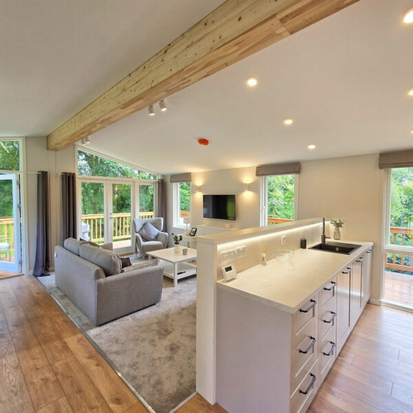 This 40’ x 20’ 2 bedroom / 2 bathroom Mulberry Nordic Lodge is brand new and ready for immediate occupation – in a quiet and picturesque corner plot with views over the fishing lakes and the surrounding countryside.